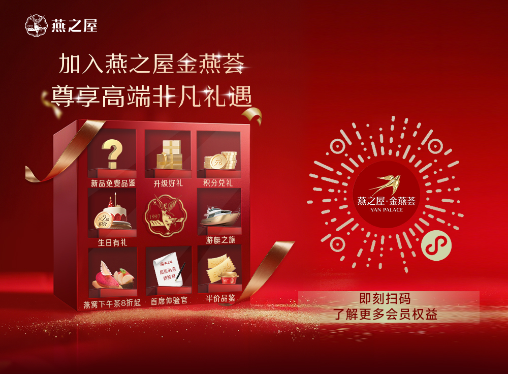 即刻掃碼,加入燕之屋金燕薈,開啟高端品質(zhì)生活,為您定制更多專寵禮遇,享受專屬的尊貴體驗。